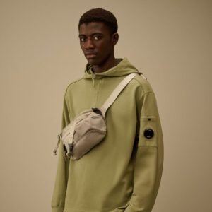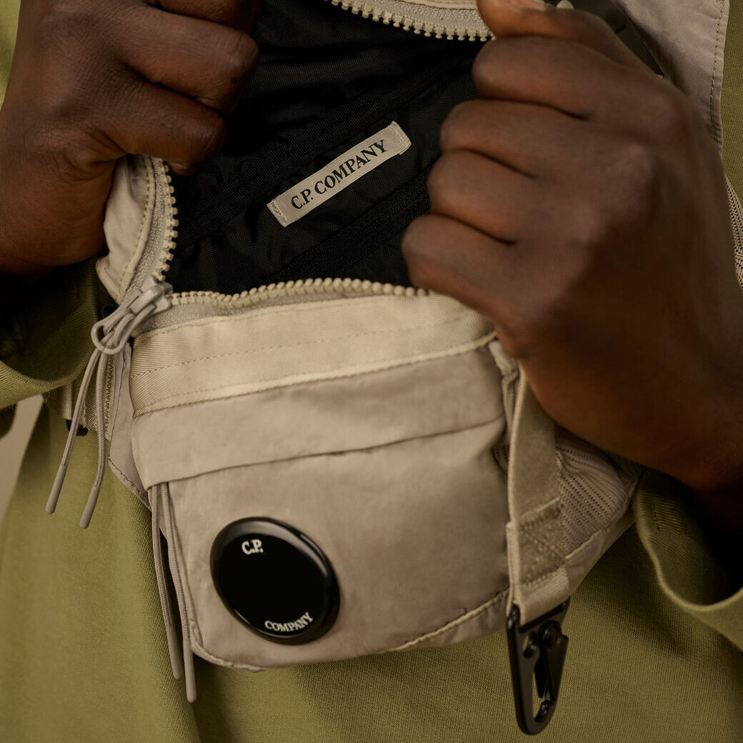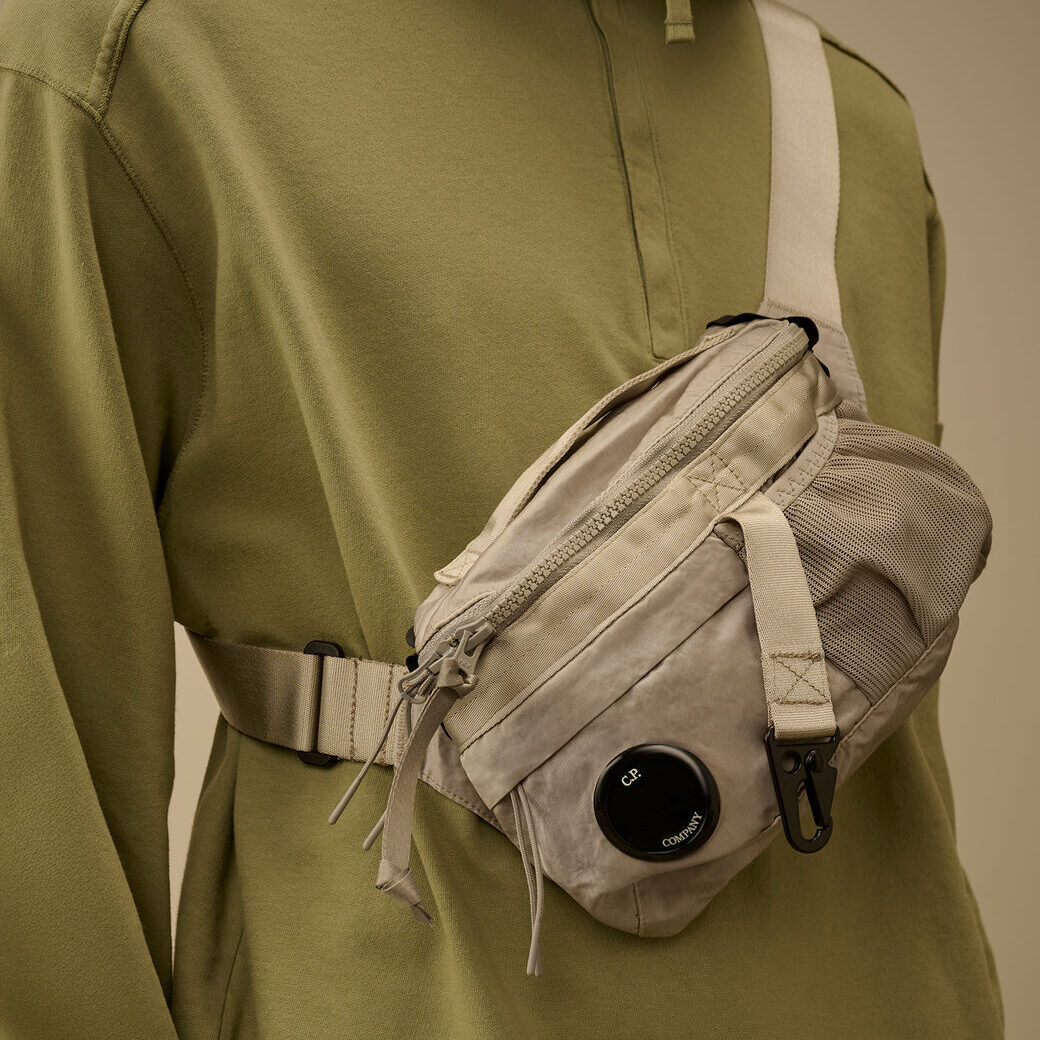 Marsupio realizzato in Nylon B, un nylon raso multifilamento di ispirazione militare, resistente e dall’aspetto lucido. Il modello presenta una chiusura con fibbia regolabile e gancio, maniglia per il trasporto, tasca frontale in rete e una tasca frontale nascosta con zip e iconica Lente di C.P. Company.