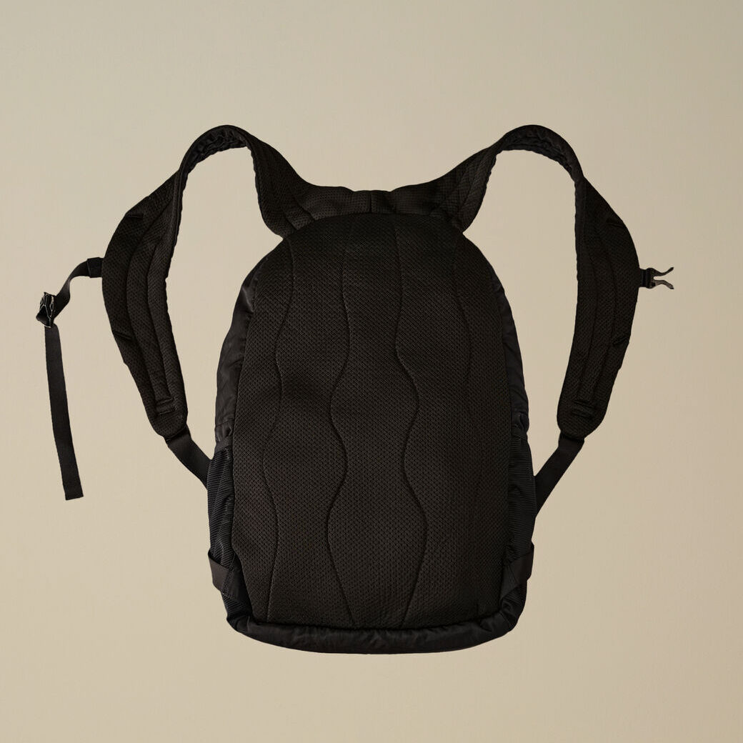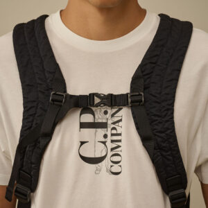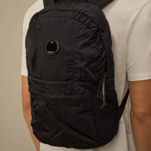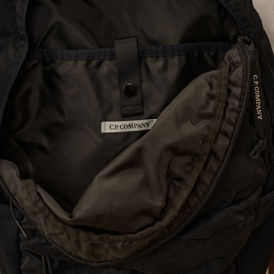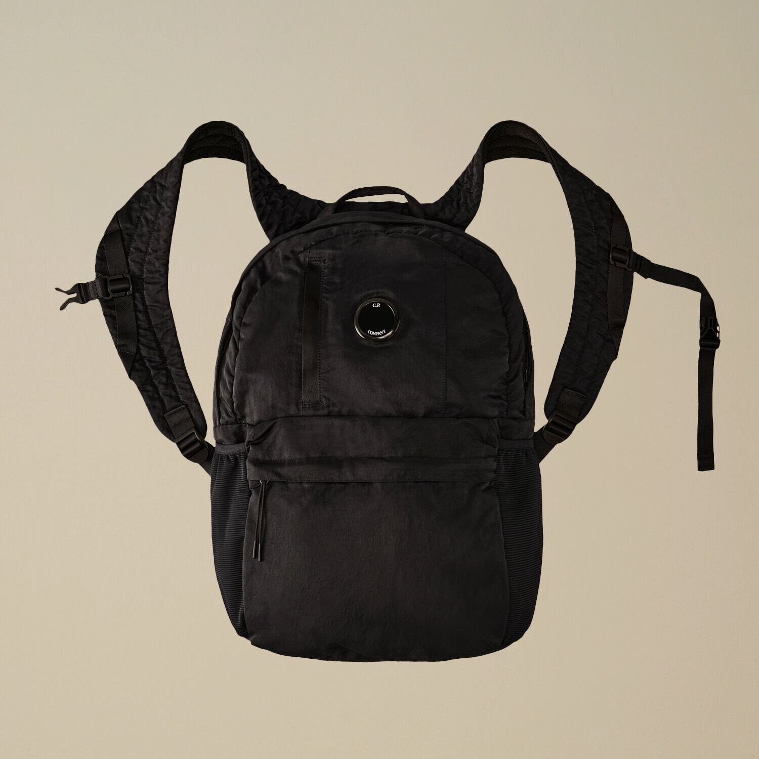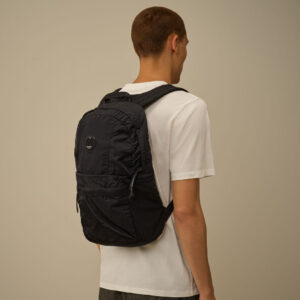 Zaino realizzato in Nylon B, un nylon multi-filamento raso di ispirazione militare. Lo zaino è dotato di cinghie regolabili con fibbie, spallacci imbottiti e impugnatura. Il design include una tasca con zip nascosta con l’iconica Lente di C.P. Company, una tasca sul fondo con zip, una rete laterale e una tasca interna con bottone automatico. Tinto in capo e trattato antigoccia.